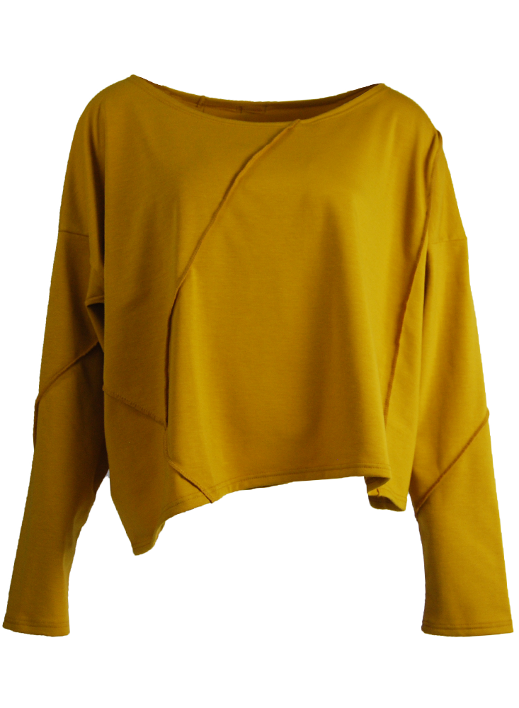 Een kort wijd shirt met vlakken en stiksels aan de buitenzijde. Het shirt is gemaakt van zacht elastisch katoen.