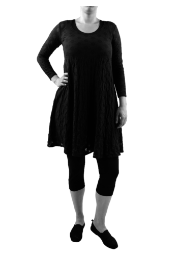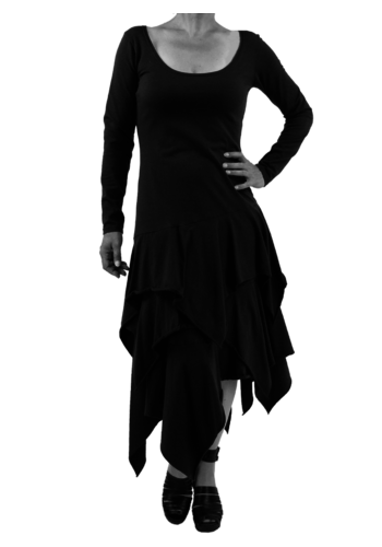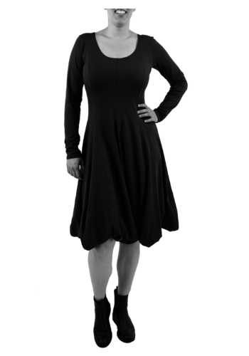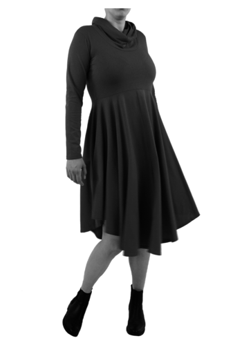 Jurk met cirkelrok , lange mouwen en een wijde col die los"gedrapeerd" rond de hals valt.